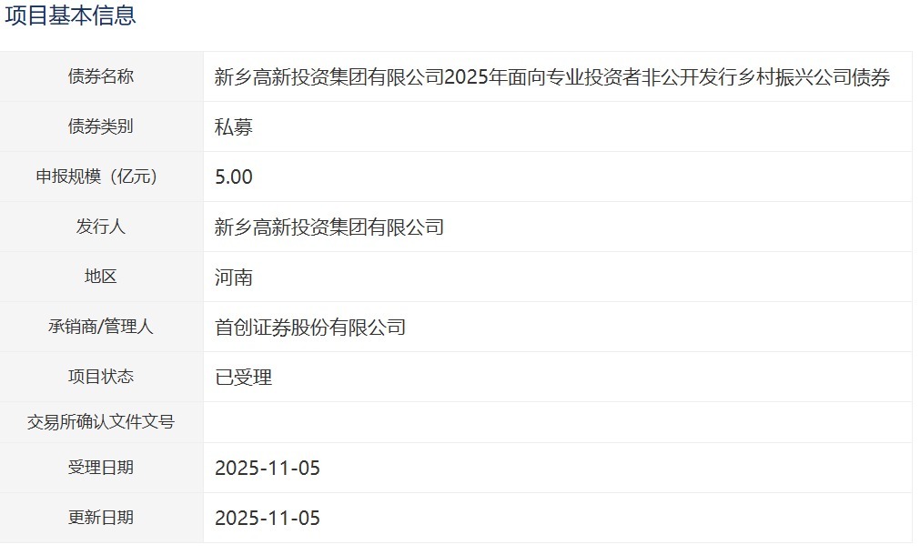【大河财立方消息】11月6日消息,新乡高新投资集团有限公司2025年面向专业投资者非公开发行乡村振兴公司债券项目获深交所受理。本期债券拟发行规模5亿元,承销商/管理人为首创证券。