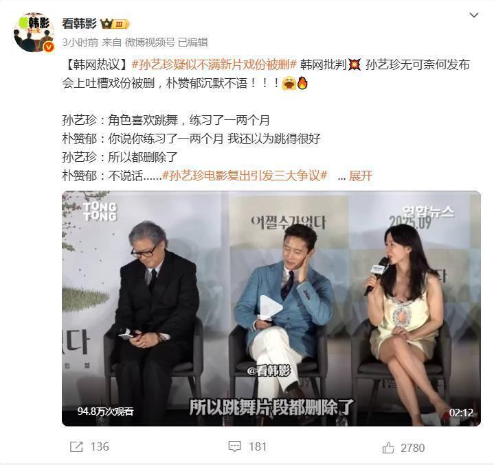 事件起因于孙艺珍在发布会上透露,自己为角色苦练一两个月的舞蹈戏份,最终被导演全数删除。她以略带调侃的语气“委屈”说道:“听说我练习很多次,导演原本期待很高,但实际看完后说‘没有到那个程度’。”而当记者追问舞蹈水平时,朴赞郁导演选择沉默不语,现场气氛一度微妙。