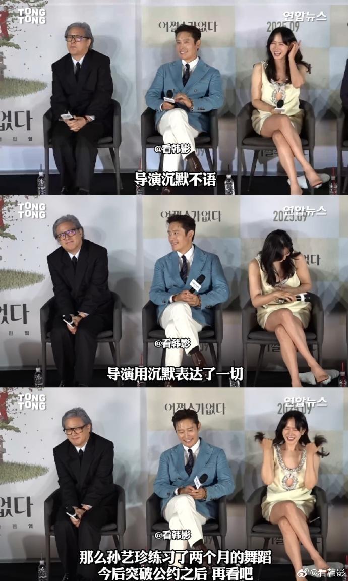 然而,现场视频显示,孙艺珍发言时面带笑容,导演与其他主演——包括李秉宪在内——也参与调侃,整体氛围轻松愉快。她甚至在谈话中不断强调自己对导演和男主角的尊敬与欣赏,将自己描述为“低调渺小”的剧组一员,显然是以谦逊姿态活跃现场。
