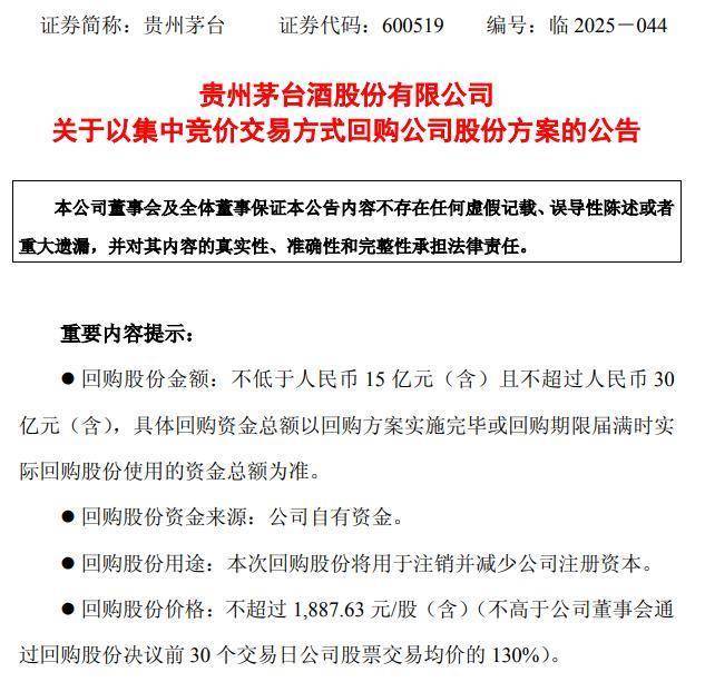11月5日晚间,贵州茅台(600519.SH)发布公告称,公司计划以集中竞价交易方式回购股份,资金总额不低于15亿元且不超过30亿元,回购价格不超过1887.63元/股。
