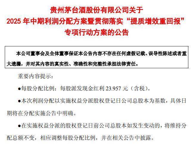贵州茅台当天还发布公告称,公司于2025年11月4日召开第四届董事会2025年度第十四次会议审议通过了《2025年中期利润分配方案》。公司拟以实施权益分派股权登记日公司总股本为基数,实施2025年中期利润分配。本次利润分配方案为每股派发现金红利23.957元(含税),合计拟派发现金红利约300亿元(含税)。该方案需提交公司股东大会审议。